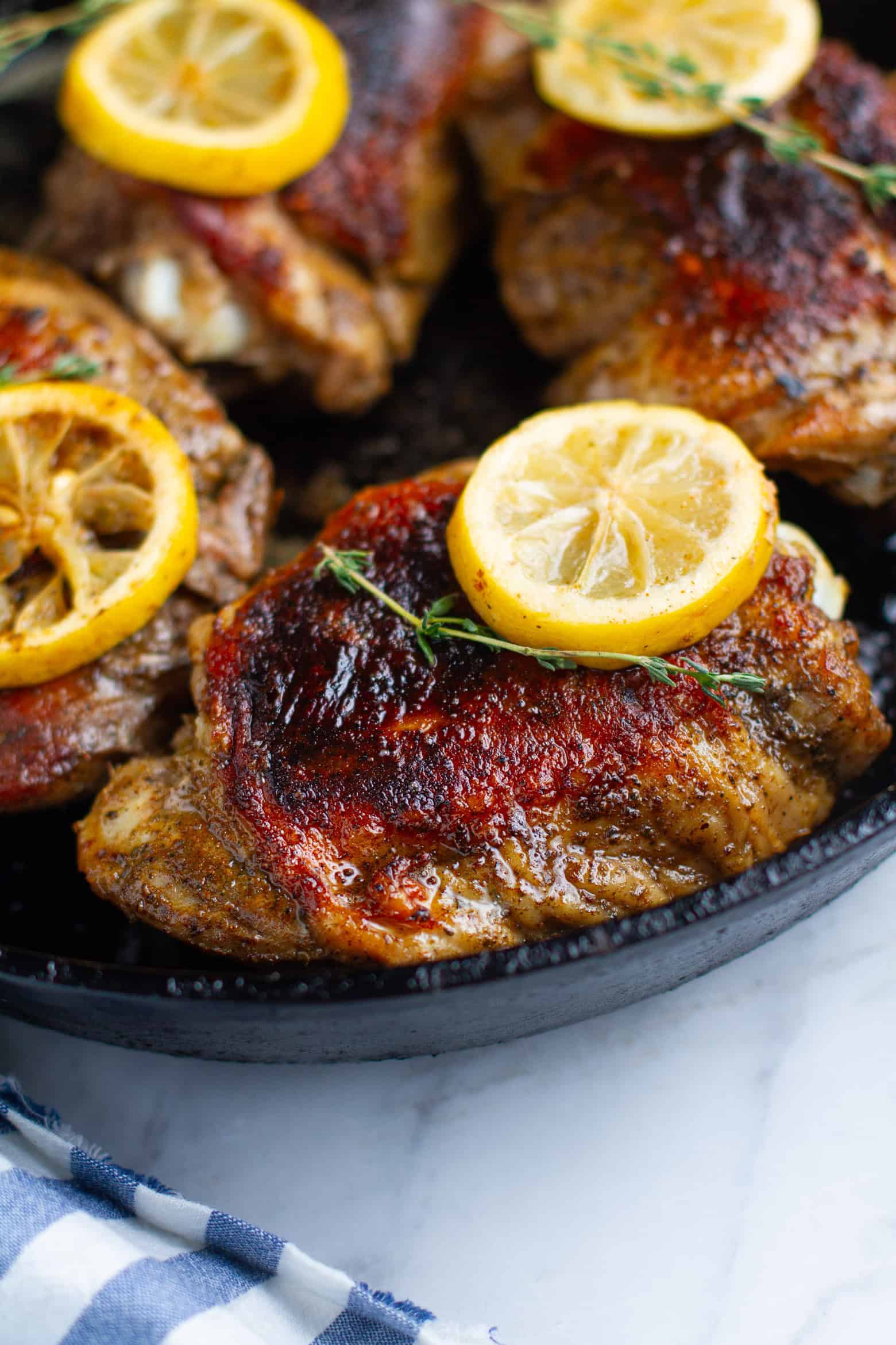 Heat over medium heat and cook for 6-8 minutes, until the skin is golden brown and slightly crisp. Flip over, add butter. Once the butter has melted, baste the thighs and serve immediately with your favorite sides.